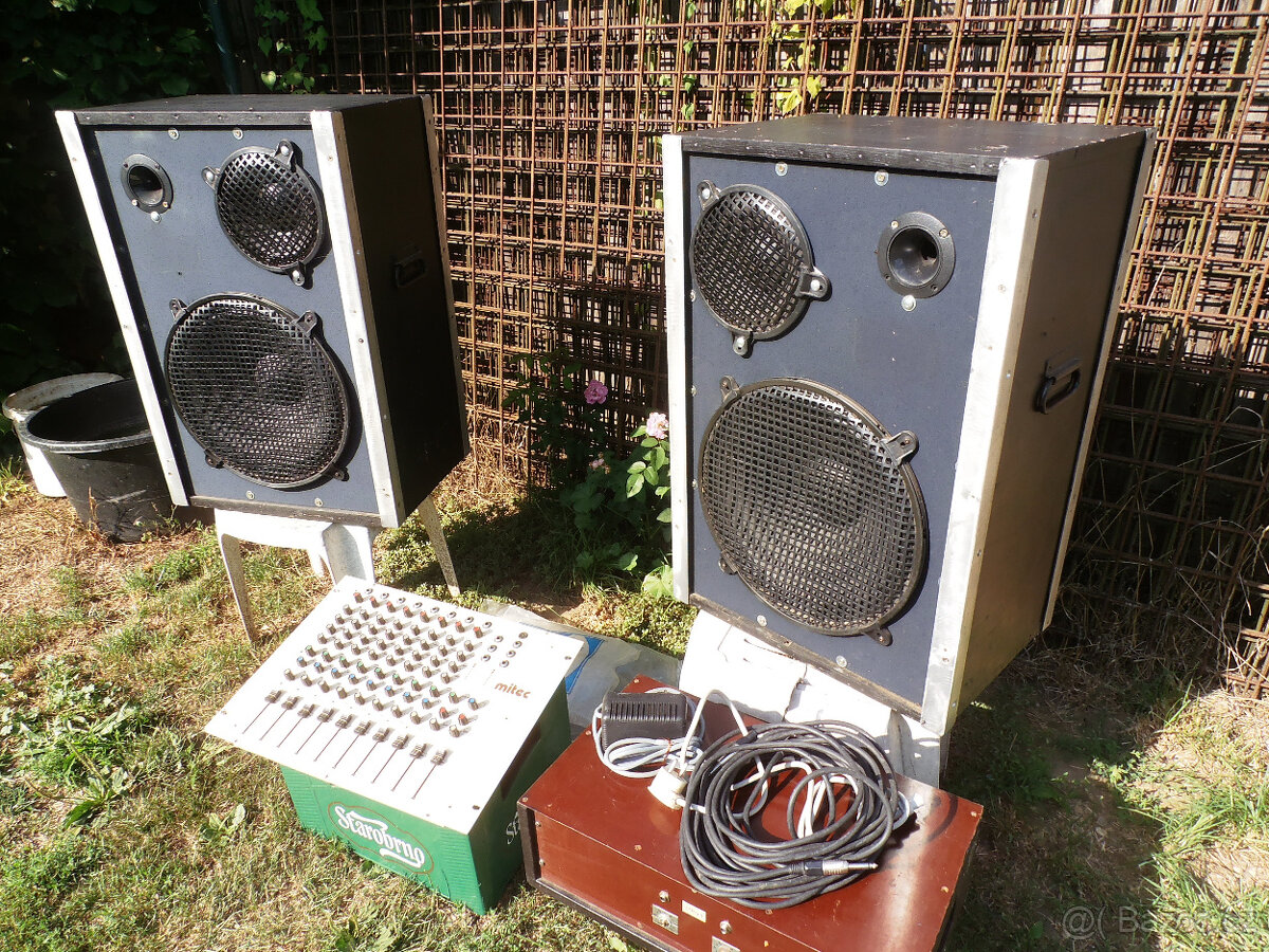 Kompletní, včetně kabelu.2ks bedny s vyhýbkou,1ks zesilovač 2x200w, MIX Mitec 802 osm vstupů.