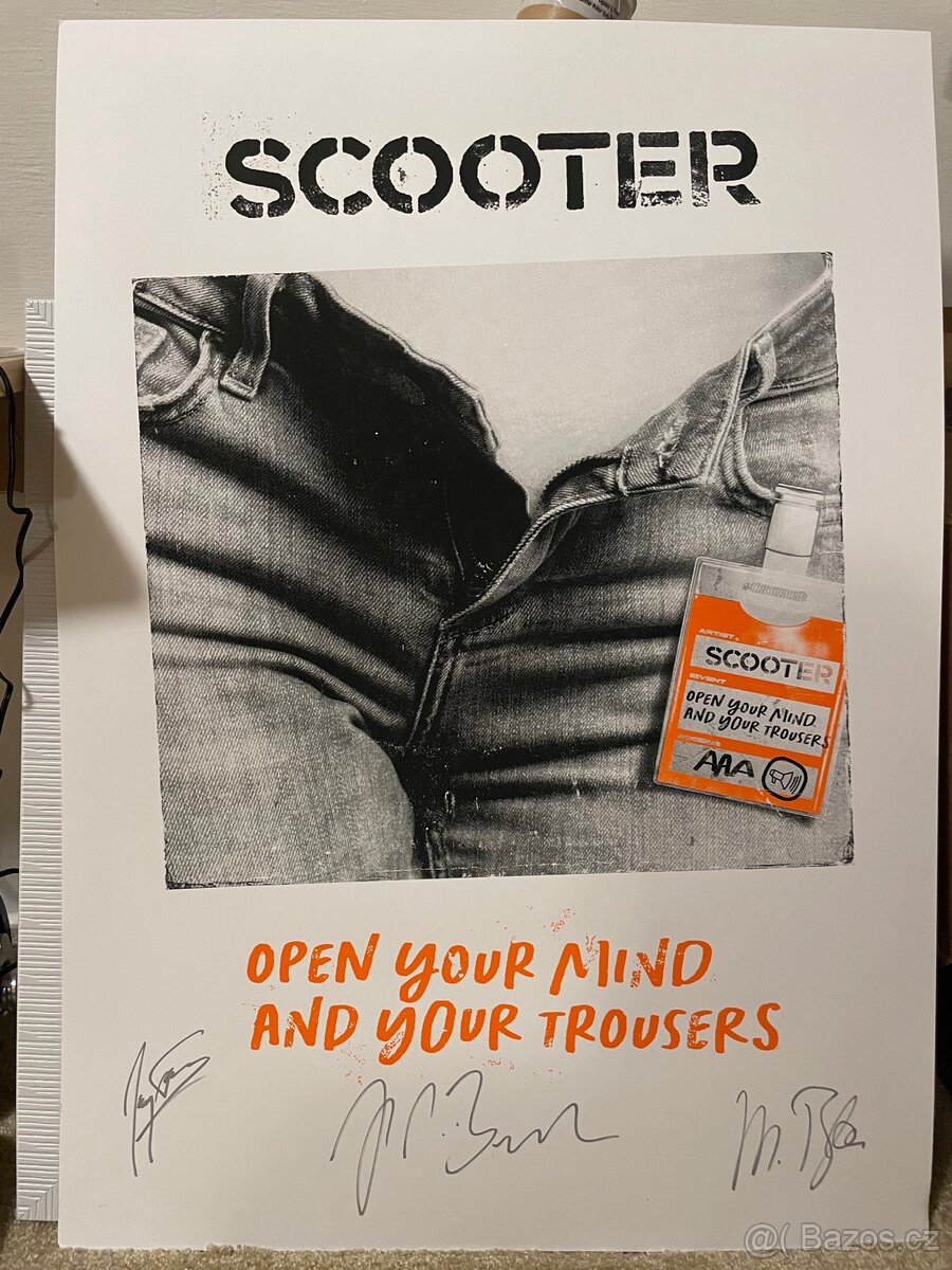 Nabízím original podepsaný plakát k vydanému albu Open your mind and your trousers, který byl k dispozici na jejich web stránce scootertechno.com