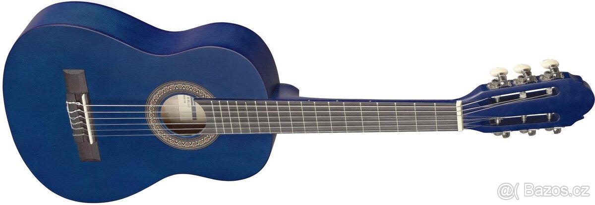 Stagg 405 M modrá. Klasická kytara pro děti o velikosti 1/4. Vrchní deska lípa, spodní deska a luby lípa, hmatník a kobylka kompozitní ořech, mechanika klasická, niklovaná. Barva modrá matná. Lehké oděrky laku viz detailní foto, hraje dobře, drží naladěná. Stáří 2 roky. Ideální pro start v ZUŠ, my už jsme povyrostli do větší velikosti.