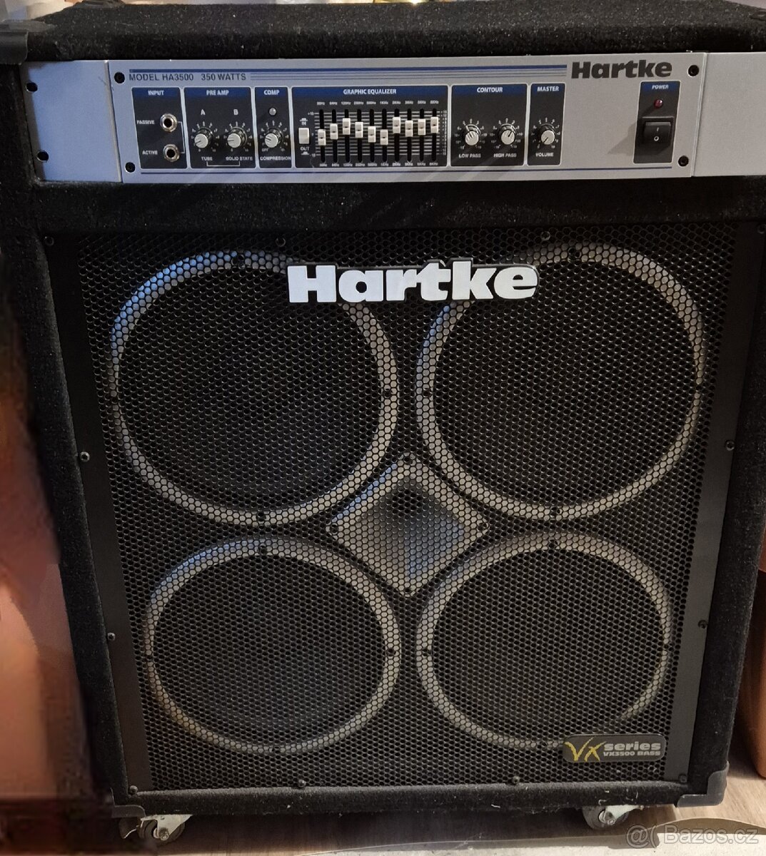 Prodám skvělé basové kombo Hartke VX 3500, málo hrané, plně funkční, bez viditelného poškození. Výkon 400W, 4x10" +1 horna s titanový driverem, hybridní zesilovač s lampovym predzesilovacem. Originální kolečka vyměněna za stabilnější a pohodlnější na přepravu.