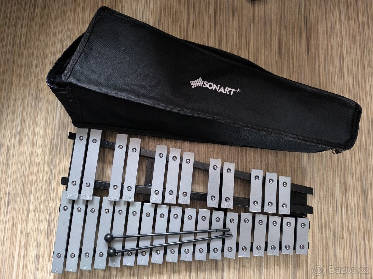 Prodám kovový, skládací xylofon (metalofon) zn. Sonart, včetně přenosné brašny a dvou paliček.