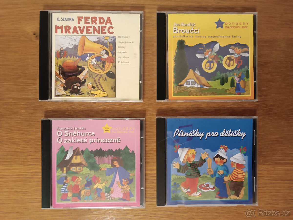 Prodám CD se známými pohádkami (Ferda Marvenec, Broučci, Sněhurka, ...) a písničkami pro děti. Cena 50 Kč/ks, při odběru všech 25 Kč/ks.