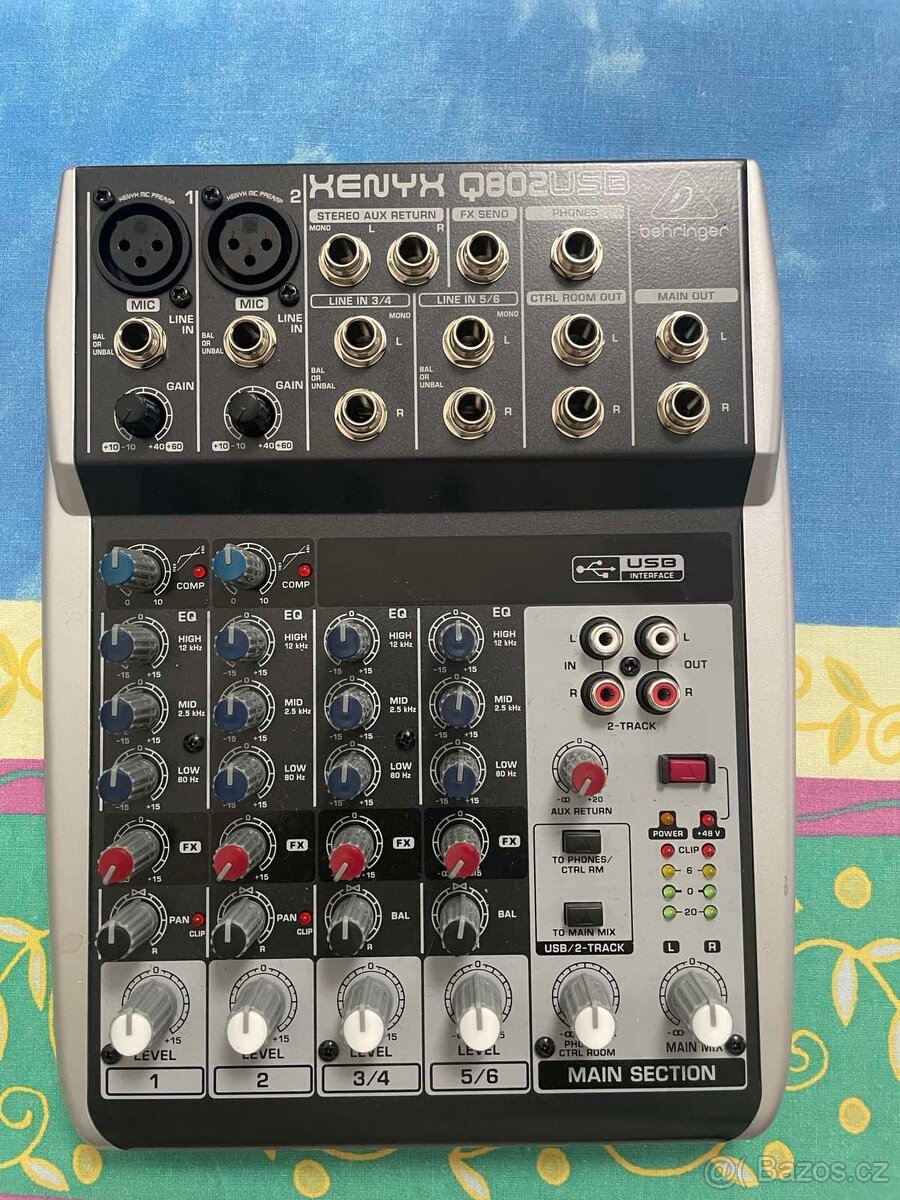 Prodám mixpult Behringer XENYX Q802USB. Analogový mixážní pult Mixážní pulty Behringer ze série Xenyx disponují mikrofonními předzesilovači XENYX s dynamickým rozsahem 130 dB a velkým frekvenčním rozpětím.Signál mikrofonních kanálů lze dobarvit třípásmovými korekcemi s charakterem britských mixážních konzolí 60. a 70. let minulého století. Mixpulty se vyrábí ve variantách s USB, kompresory, efektovou jednotkou nebo čistě analogové. Xenyx Q802 je mixážní pult se čtyřmi vstupy (2x mikrofon/linka, 2x stereo) a kompresorem na prvních dvou kanálech. Všechny kanály mají třípásmové korekce, ovladač panoramy a send pro poslání zvuku do externího efektového procesoru. Výsledný mix lze nasměrovat do hlavního výstupu, kontrolní místnosti, sluchátek nebo externího záznamového zařízení.
