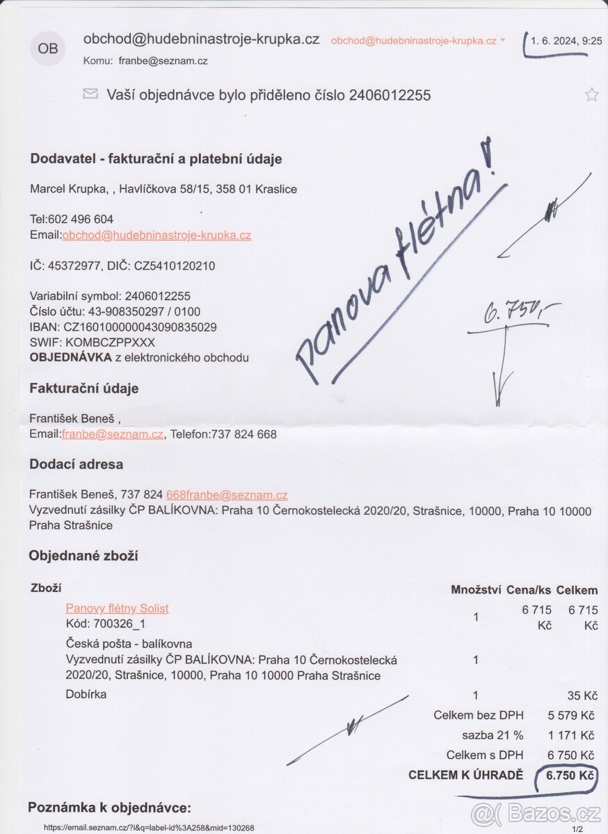Nabízím k odprodeji panovu flétnu.Viz přiložená faktura. Důvod" nestačí dech