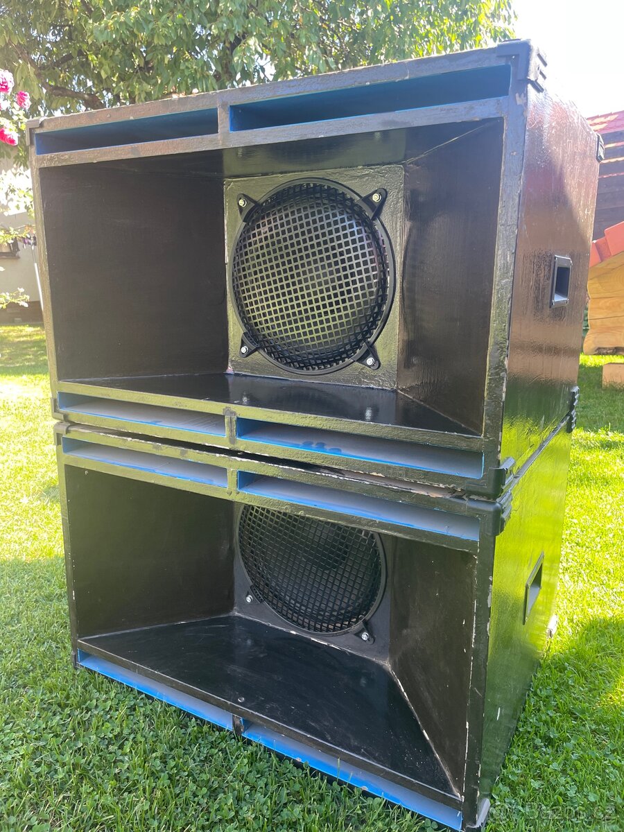 Reproduktory - [9.2. 2026]Dobrý den, prodám tuto sestavu viz. foto. Výkon 4x400 watů. Spodní bedny jsou upraveny více do basů.Začínala jsme na ní s naší kapelou. Více info po telefonu.