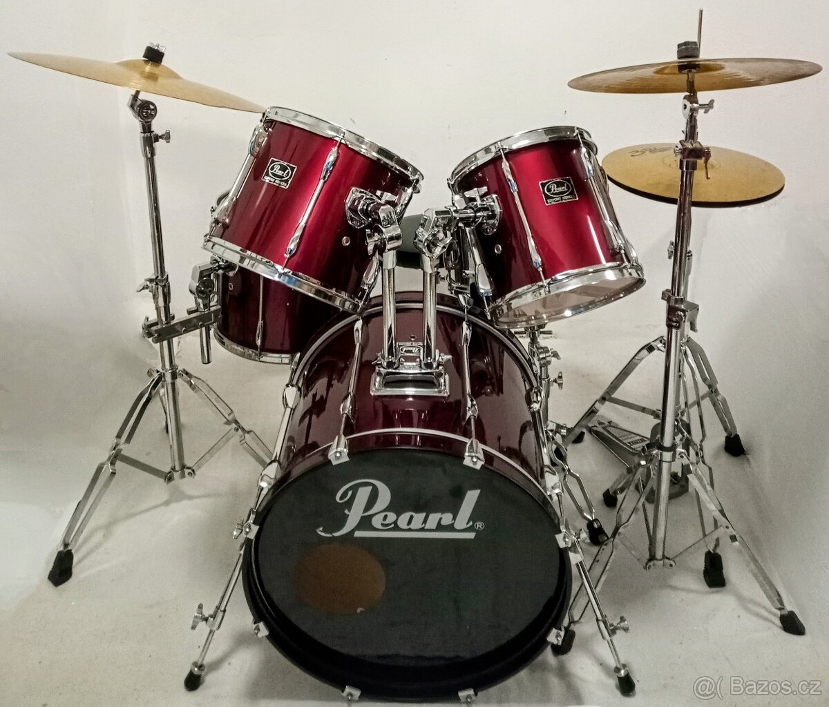 Starší souprava, ale ve velmi dobrém stavu hraná jen doma, v tmavě červené perleťové barvě, bez rzi. Korpusy ve velikosti Kick 20", Tom1 10", Tom2 12", Tom3 14", Snare 14". Činely Paiste 302 a ride Paiste pst3 viz foto. Nové čiré pinstripe blány na Tom1,2,3. Rezonanční blány a na rytmičáku původní Pearl. Ladicí klíč, hikor paličky, bubenická stolička.