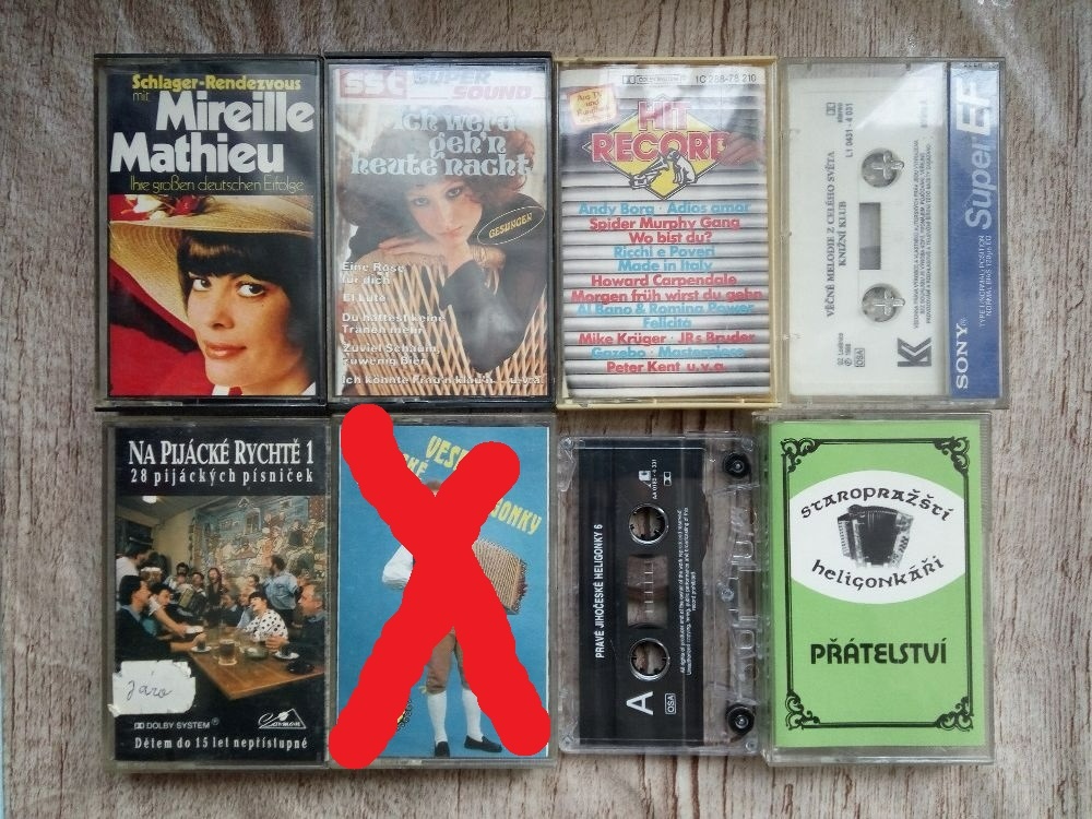 MC kazety dechovecky české i moravske - [24.2. 2026]Originální kazety dechovek na snímku vlevo (či dole) celá řada originálem (kus 30 Kč), perfektní stav, řada kazet vpravo (Sony,TDK aj.) o neco levněji po 20 Kč/ks, s výjimkou kazet Schovanky a Kučerovi (po 100 Kč).sm i dechovky na LP, deskách, většin ...