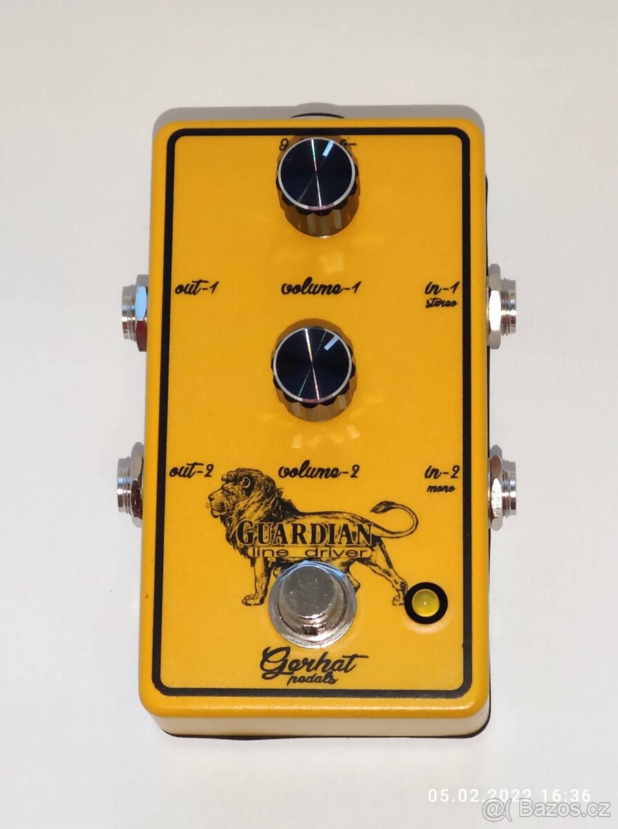 Guardian - LineDriver stereo. Pedal je vhodný pre nástroje a linkové zariadenia, kde je potreba signálovú cestu rozdeliť a potlačiť vplyv dlhých káblov na zvuk. Oproti klasickým Bufferom ma výhodu úpravy nastavenia hlasitosti zvuku, pri nízkych úrovniach vstupného signálu.