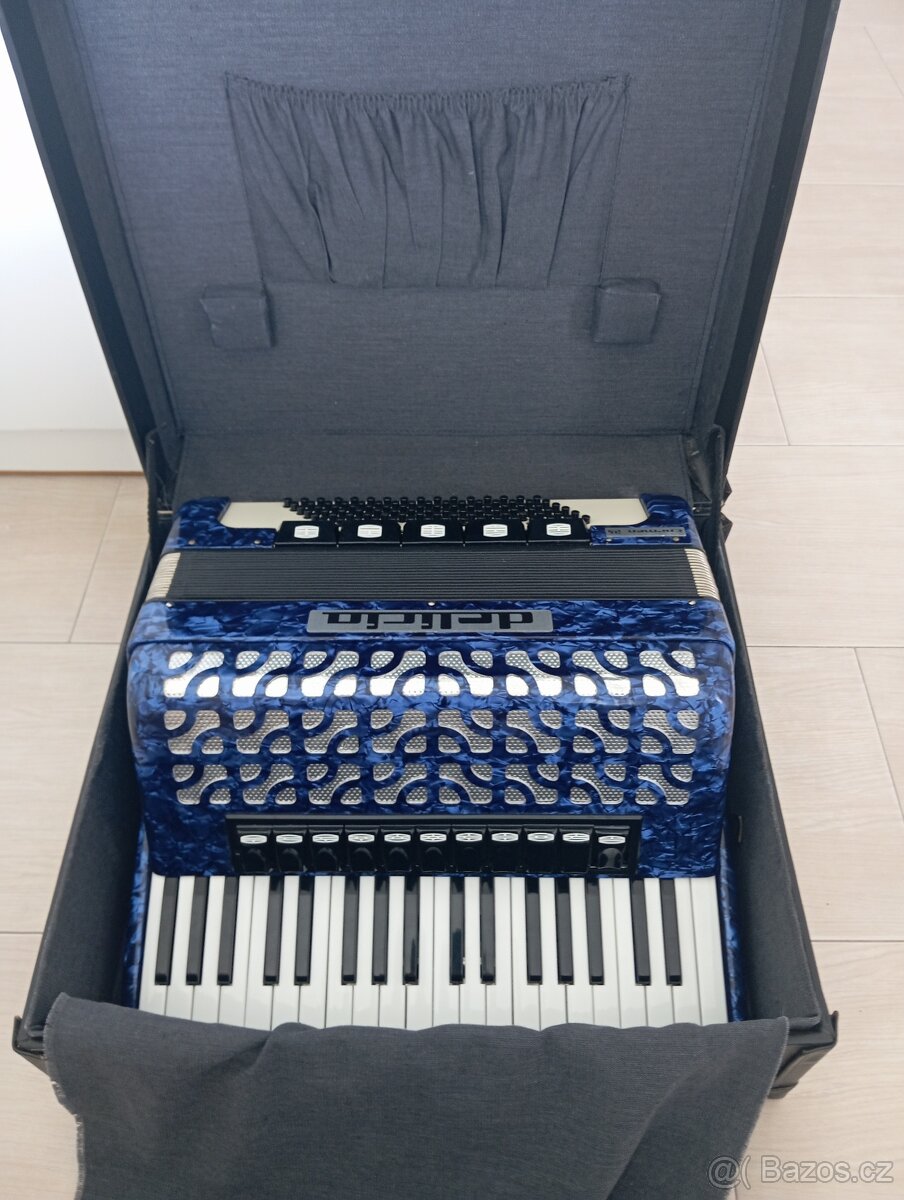 Akordeon střední velikosti pro hraní v sedé i ve stoje na který se dá zahrát všechno.