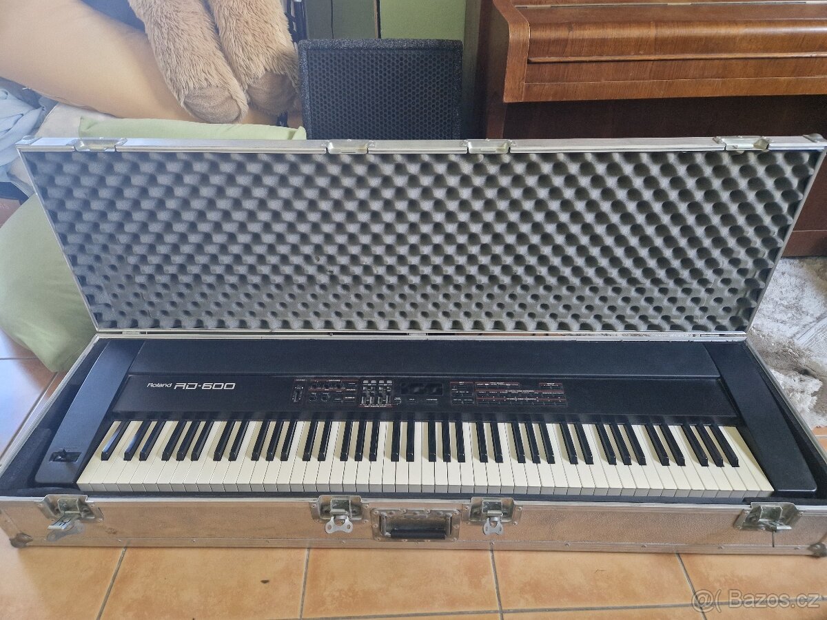 Prodám stage piano Roland RD 600: legendární nástroj zejména díky akustickému pianu a kladívkové mechanice. Celkem 128 zvuků různých kategorií, plný rozsah (88 kláves), polyfonie 64 hlasů. Dále např. možnosti split a layer, editace zvuků, 64 pamětí nastavení, 3 efektové jednotky (reverb, chorus, EFX) s mnoha možnostmi, třípásmový analogový ekvalizér, transpozice a jemné ladění, ovladač pitch bend a modulace atd. Konektory: dvě sady audio výstupů a sluchátkový výstup, MIDI in/out/thru, 3x pedal. V zánovním stavu. V ceně velmi robustní a kvalitní case, dělaný na zakázku přímo pro tento nástroj (úchyty pro přenášení jednou i dvěma osobami). V případě dohody rád dodám i profesionální masivní stojan Proel až pro troje libovolně velké a těžké klávesy, zkombinovaný se stojanem na mikrofon pro zpěv či mluvené slovo. Cena 19000 je včetně case, který je pro takto kvalitní a citlivý nástroj zcela nezbytný.