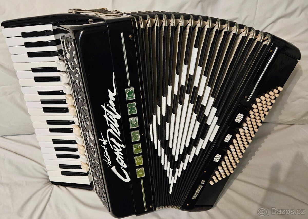 Delicia Melodia VI 96 basov akordeón harmonika - [30.4. 2026]Predám akordeón harmoniku Delicia (Lignatone) Melodia VI 96 basov,čierno-zlatá farba,plný 4 štvorhlas krásny sýty zvuk ako orgán,10 registrov na pravej časti a 3 basové registre,nástroj je v zachovalom stave bez chýb v plne funkčnom stave a bol skont ...